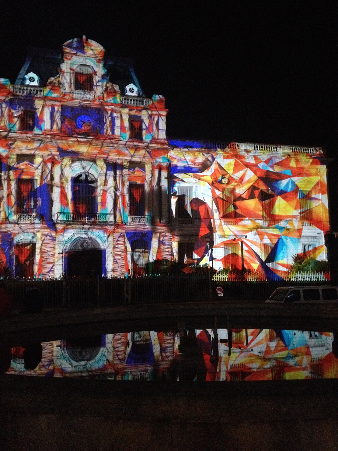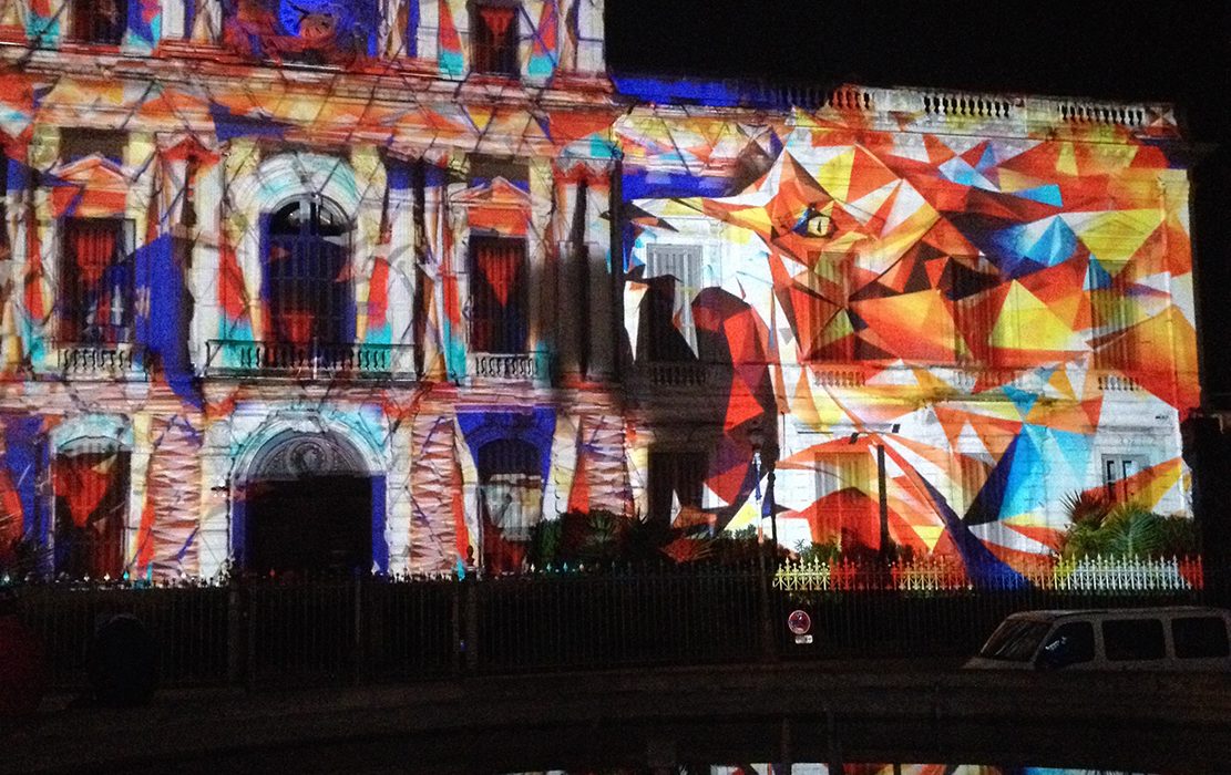 Vidéo-mapping sur la façade de la préfecture de la Ville de Montpellier en collaboration avec « IDscènes », Julien Cano et Élodie Ponçon, décembre 2016